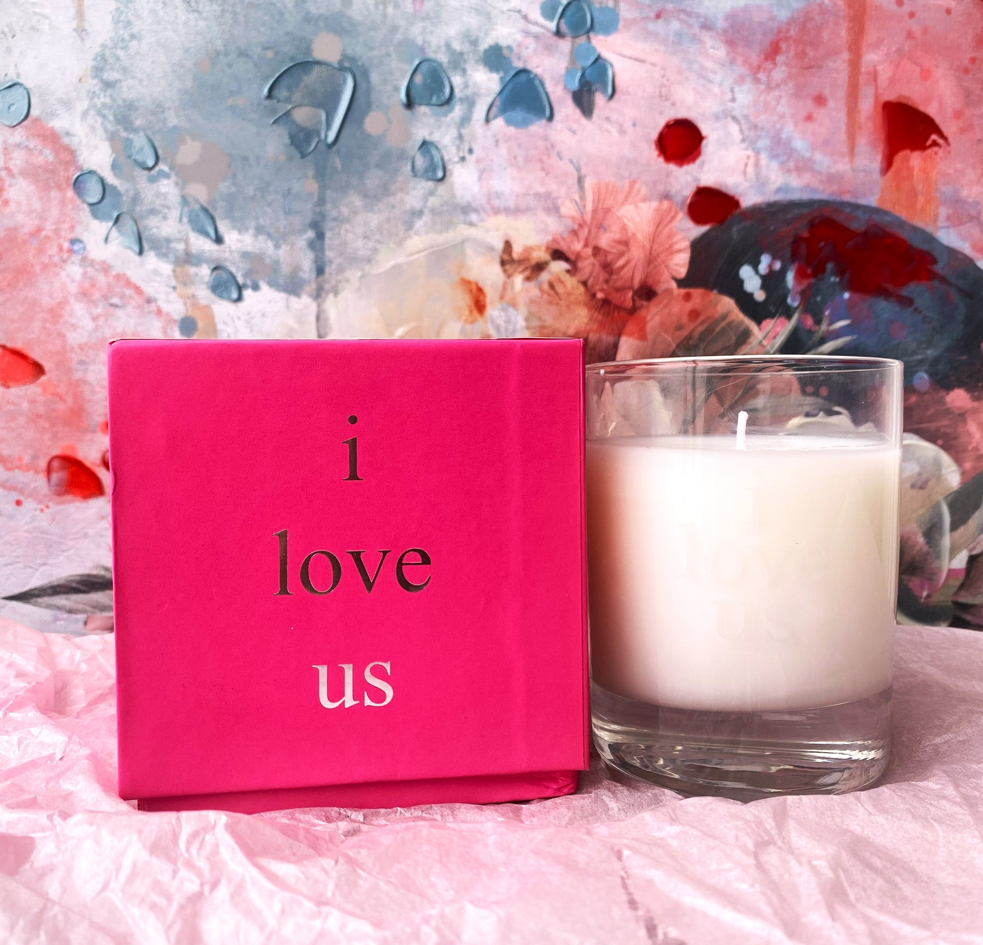 Each candle is 11.5oz and made with a soy-blend wax with gold glitter that sparkles with the flame. Every "I Love Us" candle comes with a specially designed, pink box and reveals a secret message when lit.